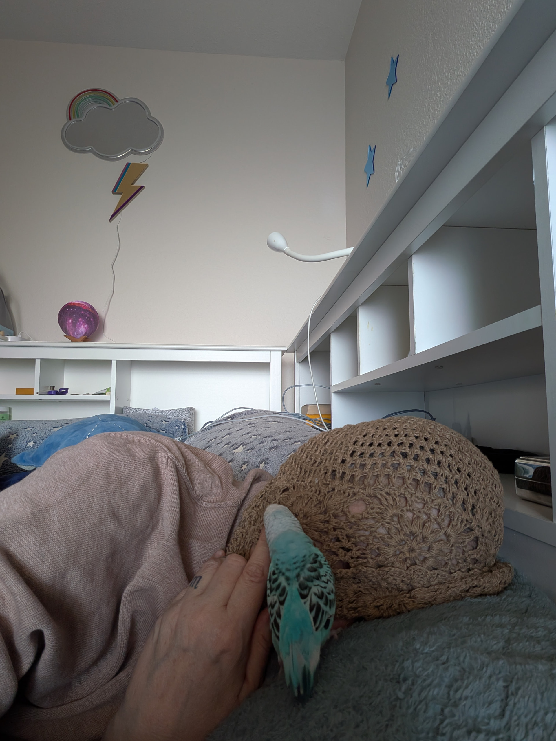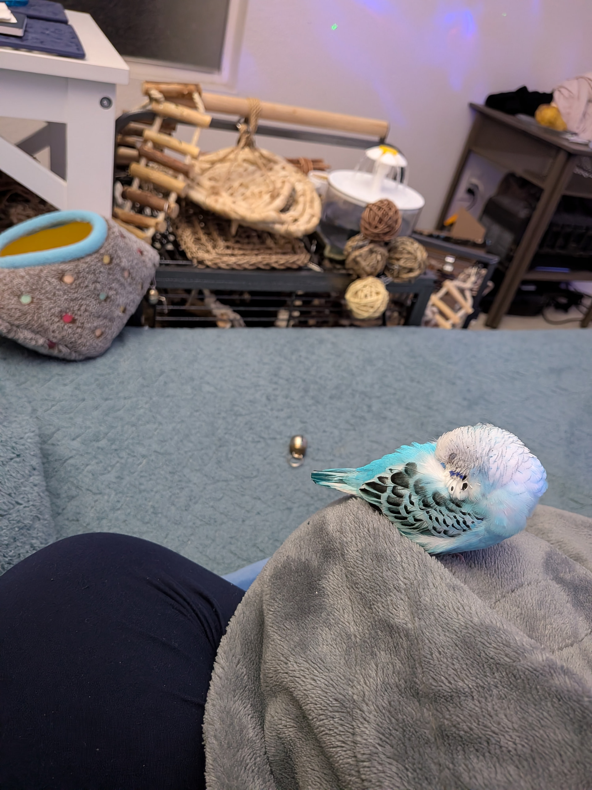 Peppy likes to sleep on me. I get up to smoke sometimes and he skwaks when I move him.
